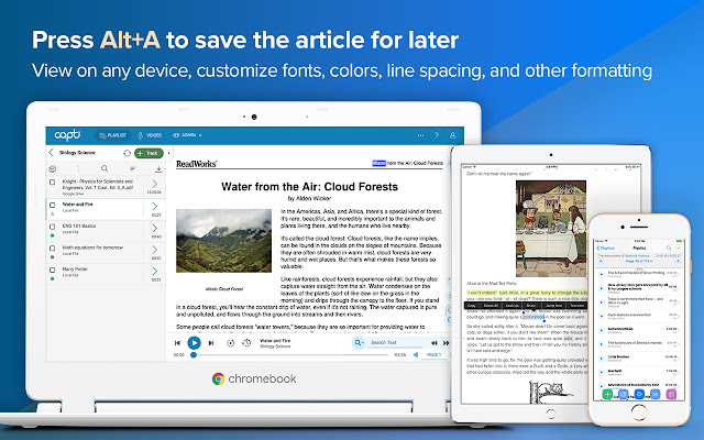 使用 Capti 浏览器扩展程序,您可以:收听网络文章、格式化网页文本以使其更易于阅读,以及将内容保存到 Capti 云。稍后从 Capti Web 和 iOS 应用程序访问您的内容。