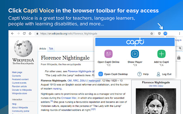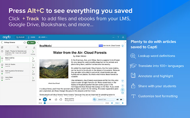 使用 Capti Chrome 扩展程序收听文档、书籍和网络文章。