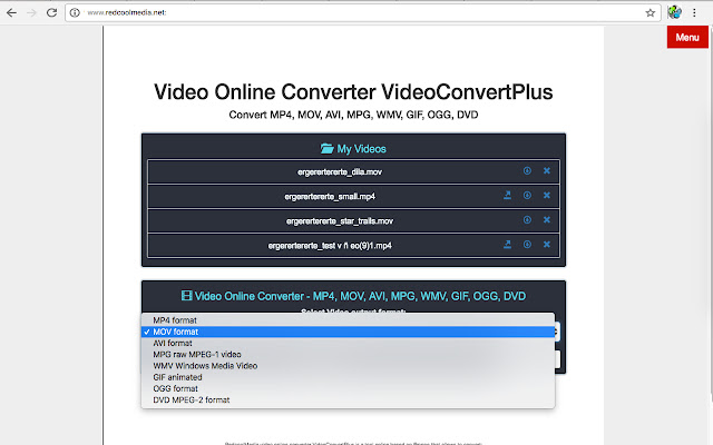VideoConvertPlus支持的在线转换为AVI,MP4,MPEG,MOV,WMV,DVD,OGG和动画GIF。