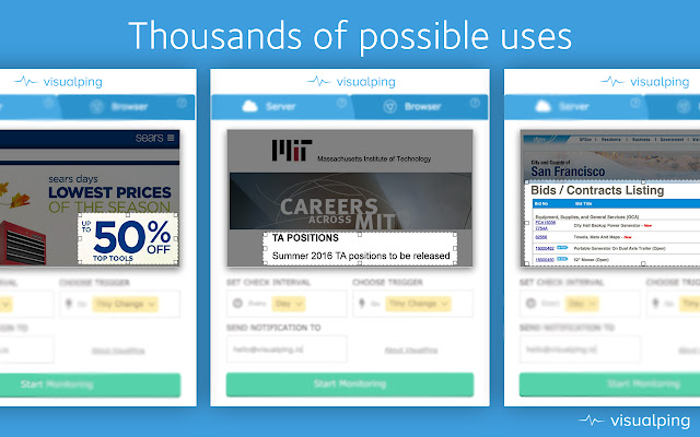 与其他监控服务相比,Visualping 以视觉方式监控页面,而不是基于 HTML 标记。使用该服务进行比赛监控、价格检查、门票可用性跟踪等。