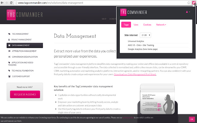 Commanders Act Assistant 可帮助您验证您的技术团队是否已在您的页面上正确实施容器和数据层。只需导航到任何页面,TagCommander Assistant 就会告诉您哪些容器和标签是 psent,哪些变量是 psent 及其值,使用了哪些 cookie 以及调用了哪些命中和脚本。 TagCommander Assistant 还提供了从一个版本的容器切换到另一个版本的能力,以便在 LIVE 环境中模拟新的或旧的容器版本。