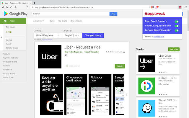 该扩展程序可以非常轻松地更改 App 和 Play 商店中任何应用程序视图的国家/地区和语言。只需单击一下,您就可以比较不同国家和语言的任何应用程序的元数据。