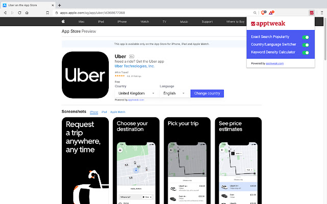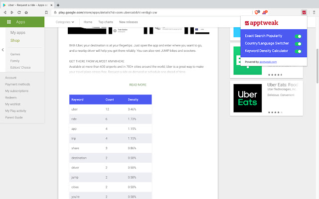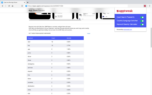 提取苹果的搜索热度得分;在 App 和 Play 商店应用程序视图中轻松从一个国家切换到另一个国家;使用此 ASO 免费工具计算任何应用程序的描述密度。
