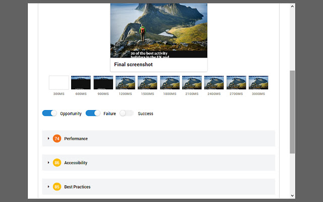 - 对性能、可访问性、最佳实践、搜索引擎优化和渐进式 Web 应用程序的错误和建议进行全面分析和评分