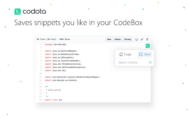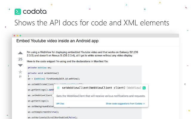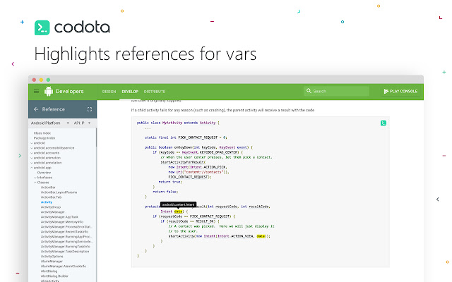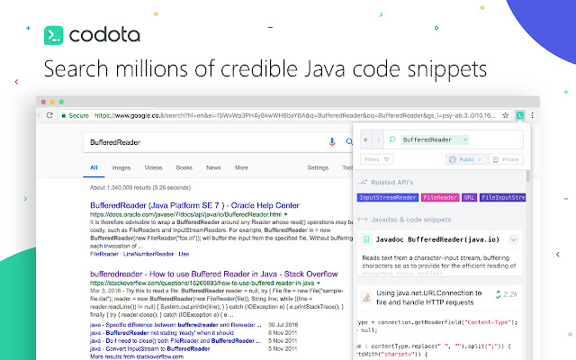 将您的浏览器变成强大的代码查看器,让 android 和 java 代码片段栩栩如生。 Codota 分析网页中的代码片段并帮助阅读、理解和保存代码。