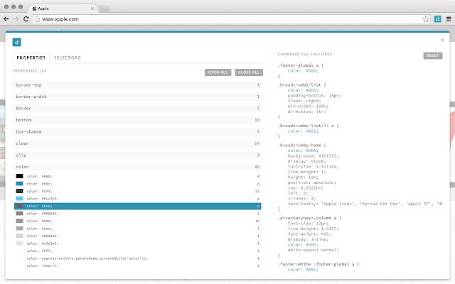 属性:查看所有 CSS 属性、它们的频率和变化。有太多的蓝色阴影?不一致通常意味着您的开发人员的困惑和您的最终用户的违规行为。