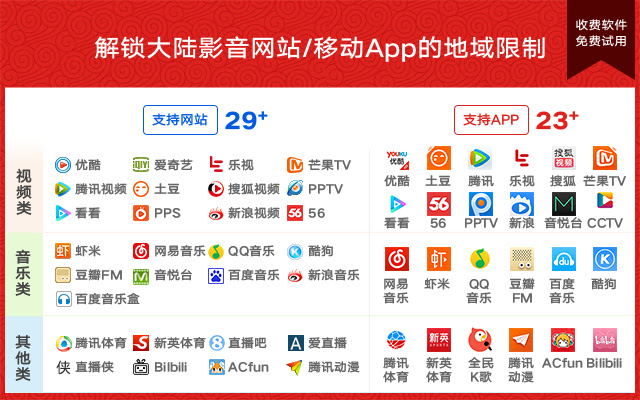 解锁youku、bilibili、iqiyi等大陆影音网站的地域限制,已支持国内所有主流的影音网站和APP,开箱即用,无需配置。