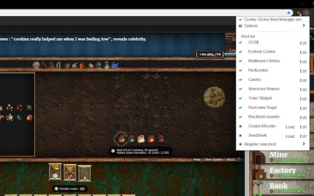 这允许用户指定在加载 Cookie Clicker 游戏时加载的模组和附加组件列表。可以打开和关闭 mod,并且可以禁用整个扩展。还具有导出和导入配置的能力。