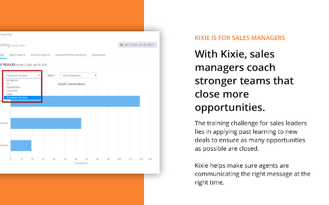 借助 Kixie,销售经理可以指导更强大的团队,从而获得更多机会。它是销售经理的强大盟友。销售领导者的培训挑战在于将过去的学习应用于新交易,以确保尽可能多地获得机会。 Kixie 有助于确保座席在正确的时间传达正确的信息。