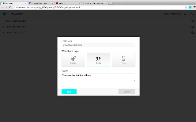 当您需要完成工作但又无法停止查看 Gmail、Facebook、Youtube 和 Reddit 等时,Timewarp 就会派上用场。