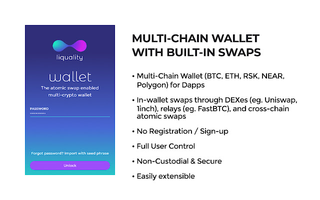 Liquality 钱包是用于在浏览器中访问比特币、以太坊 Web3、Rootstock、NEAR、Polygon、Binance Smart Chain 和 Arbitrum 应用程序的扩展。这种 MetaMask 替代方案支持多个区块链,并提供了通过内置的一键式原子交换在 BTC、ETH/ERC20、RSK、NEAR 和 Polygon 代币之间转换的最简单方法。
