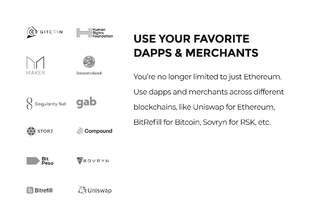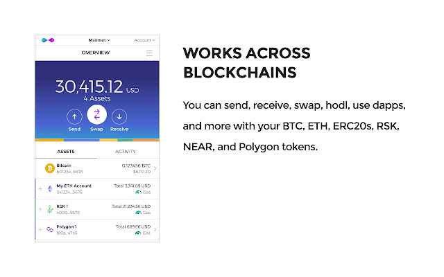 * 多链:使用您的 BTC、ETH、ERC20s、RSK、NEAR、Polygon、BSC 和 Arbitrum 代币发送、接收、交换、存储、使用 dapps 等。