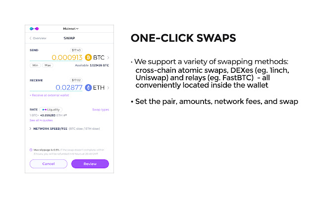 * 通过 DEX(例如 Uniswap、1inch)、中继(例如 FastBTC)和跨链原子交换进行钱包内交换