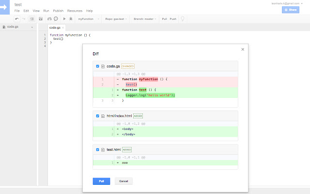 - *Pull* 实际上与 Github 的工作方式不同,因为 Google Apps Script 没有修订信息,*Pull* 只会从 github 和 OVERWRITE(不合并)中获取您的代码到项目中。