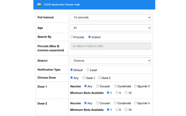 此扩展程序将监控来自 cowin.gov.in 的疫苗接种插槽,并在找到插槽后立即触发音频警报。