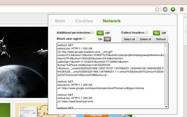 网络监控 - 用户还可以在弹出窗口中管理网络流量 - 收集 http 标头并阻止通过请求发送的用户代理数据,要使用该功能,您需要允许可选的主机权限。