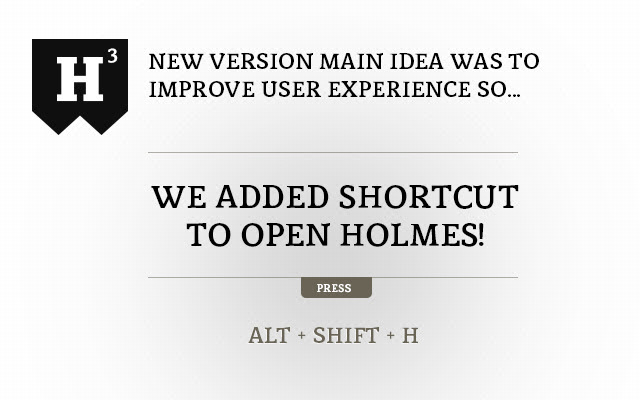 福尔摩斯也可以通过键盘快捷键激活!按 Alt+Shift+H,您就可以开始了!您可以随时根据自己的喜好更改快捷方式。转到 Chrome 菜单 > 工具 > 扩展程序。向下滚动到底部,pss“键盘快捷键”链接并为 Holmes 添加自定义快捷键!
