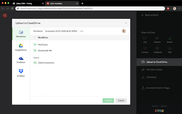 - 将带注释的图像上传到您的 Zoho WorkDrive、Google Drive、OneDrive 和 Dropbox 帐户。