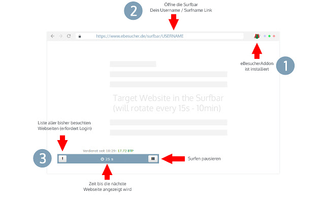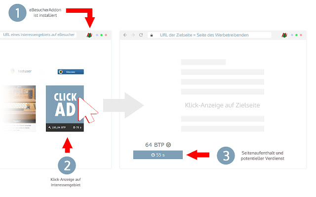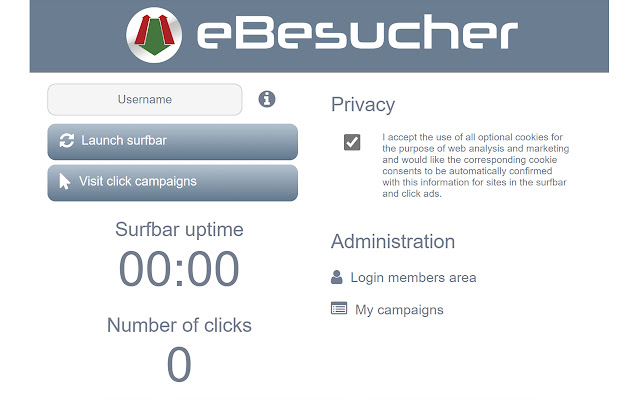 借助此扩展,eBesucher 冲浪栏和点击广告的用户可以根据他们感兴趣的领域访问合作伙伴网站,并获得 eBesucher 积分作为回报。