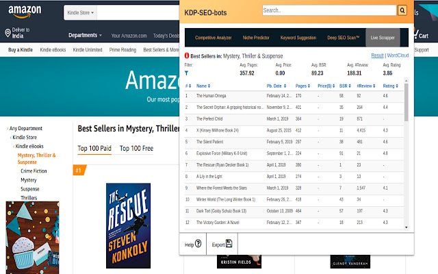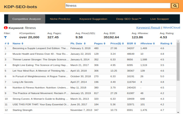 此工具可在几秒钟内为您提供针对此关键字发布的所有书籍的概览。您可以分析评论数量、页数、畅销书排名、价格和书名。如果您想为该细分市场出版一本书,该工具使您很容易看到。