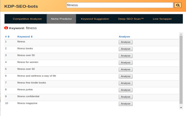 利基预测器使您可以根据输入的关键字快速检查建议的关键字。分析将在几秒钟内向您显示该利基出版的所有相关书籍以及所有重要细节。