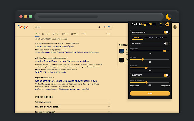 夜班和黑暗模式扩展程序会在天黑后自动将浏览器内容的颜色转移到色谱的暖端。