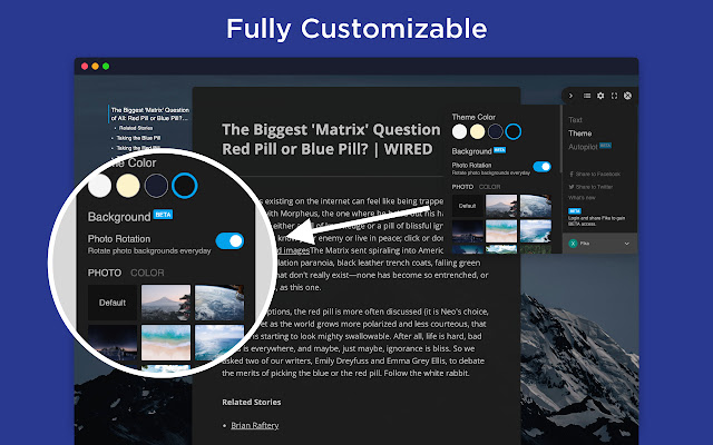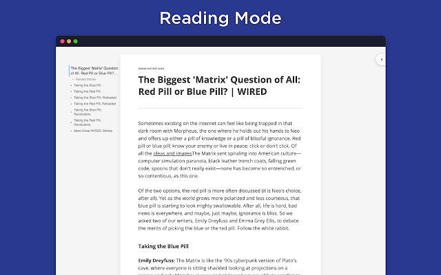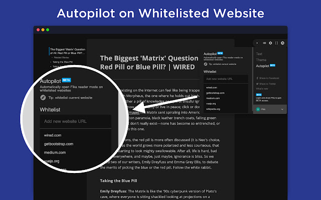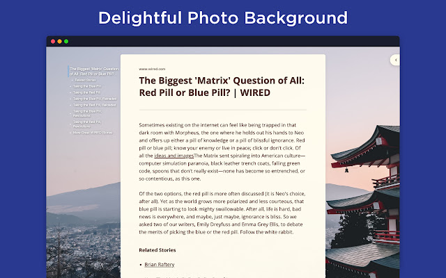 Fika 是您可以沉浸在阅读中的地方。导航器、广告、弹出窗口和可怕的布局总是会干扰阅读。 Fika 是一个工具,它可以帮助您从网页中提取主要内容并以和平阅读模式发送。除此之外,Fika 检索目录并提供四个令人愉快的主题:香草、拿铁、布拉巴、甘草。