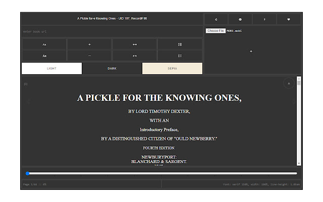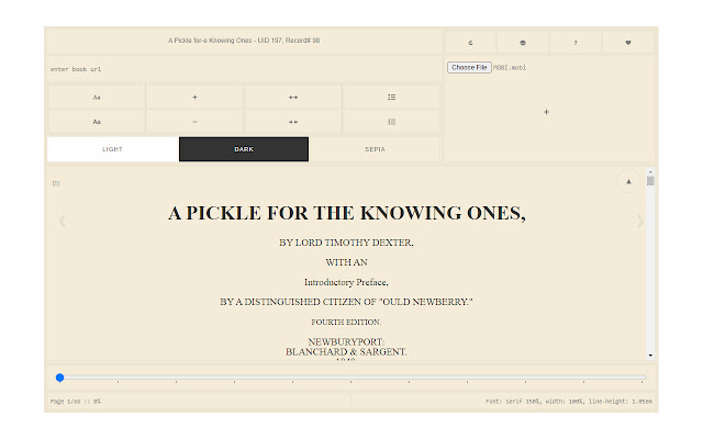 请右键单击任何“.mobi”链接,然后单击上下文菜单中的 - 查看 MOBI - 项目。或者,您可以打开弹出窗口,然后在 UI 中添加 mobi 链接以查看文档。对于离线文件,只需将文件拖到弹出窗口中的指定区域即可加载 mobi 文档。此附加组件具有深色模式,可在夜间更好地读取 mobi 文件。此外,您可以将窗口大小调整为您想要的大小,文档将自行适应新的大小。