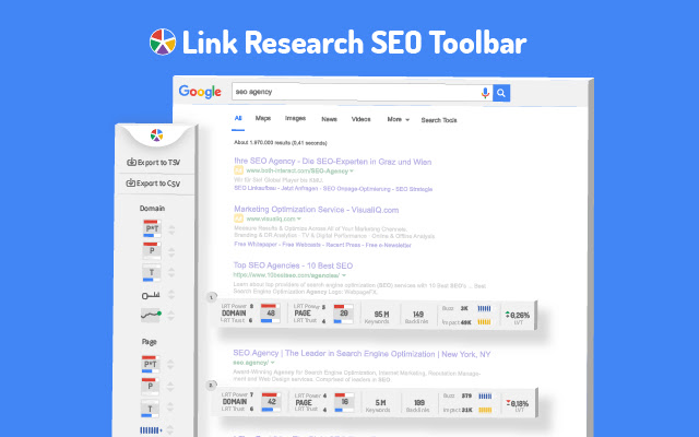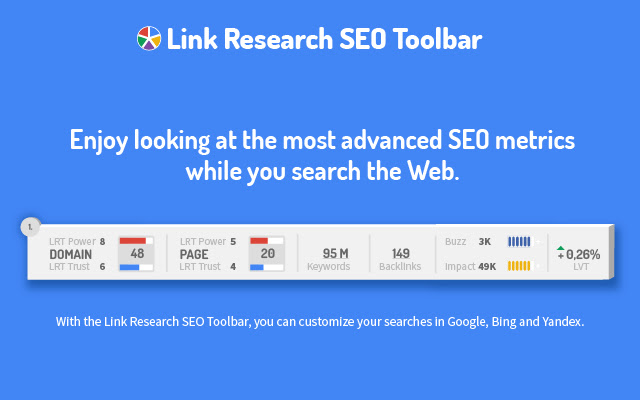 您可以使用 Link Research SEO 工具栏自定义您在 Google、Bing 和 Yandex 中的搜索。您还可以将其启用为页面工具栏,以便您查看每个页面的高级 SEO 指标。