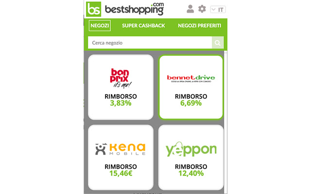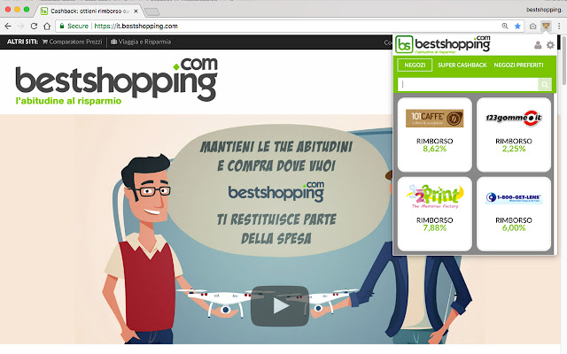 现金返还是您在网上商店支付的部分费用的退款,bestshopping 有 1500 多家商店。浏览器右上角会出现一条自动消息,点击“激活现金返还”,您可以继续正常导航,在购买结束时,您将收到购买的现金返还。无需每次浏览时都记得去 Bestshopping。