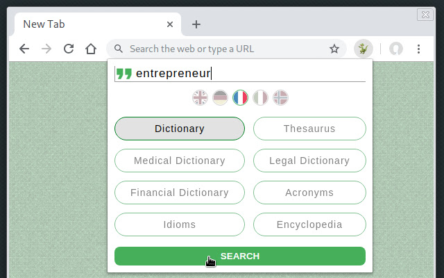 此扩展程序中也提供了 thefreedictionary.com 支持的其他语言。有关详细信息,请参阅选项页面(右键单击工具栏按钮并选择“选项”)。