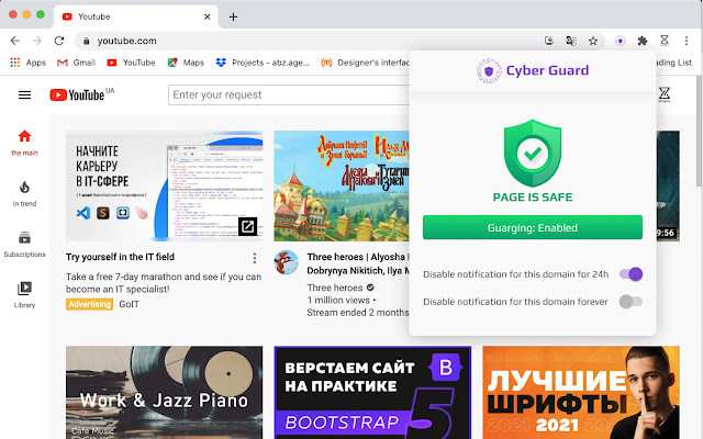 我们保护您的浏览器免于访问危险站点。 Cyber Guard 检查每个访问过的域是否存在潜在威胁。如果我们检测到访问的域不安全,您将在选项卡中收到通知。您还可以从扩展菜单更改设置。