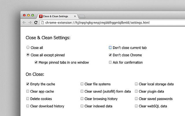 您可以将其设置为关闭所有内容、保持当前选项卡打开、关闭或保持活动的固定选项卡。还有一些其他设置:您可以将其设置为在单击“关闭并清理”按钮时要求确认,或者在清理完成后打开新的选项卡(所有设置都可以从“选项”页面访问)。