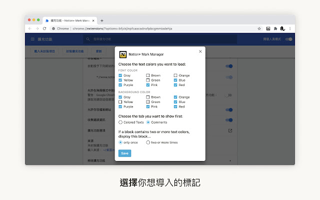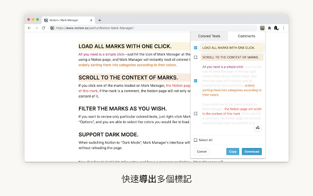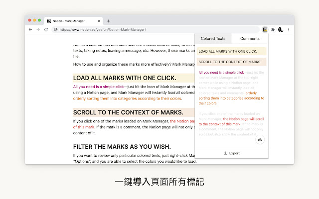 只需轻轻一点右上角的Mark Manager 图示,当前Notion 页面的颜色文字与注解,都会瞬间导入套件,分门别类、依序呈现,让你快速获知当页所有重点与留言。