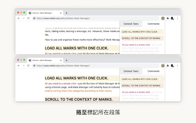 只要点击被导入Mark Manager 的颜色文字或注解,Notion 页面便会自动卷到该标记所在的段落,让你知道它的上下文是什么。如果你点的是注解,页面除了卷动,还会跳出注解上的留言──是不是很方便呢?