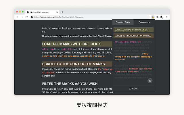 如果你是夜间模式的重度用户,别担心,Mark Manager 通通都支援!当你切换模式,套件的界面颜色便会随之变换,你甚至不用重新整理页面。