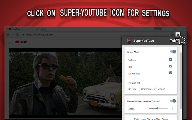 ✔ 点击 Super-YouTube 图标打开设置面板,在这里您可以启用或禁用您想要的任何功能。例如默认选项卡、音量控制等。