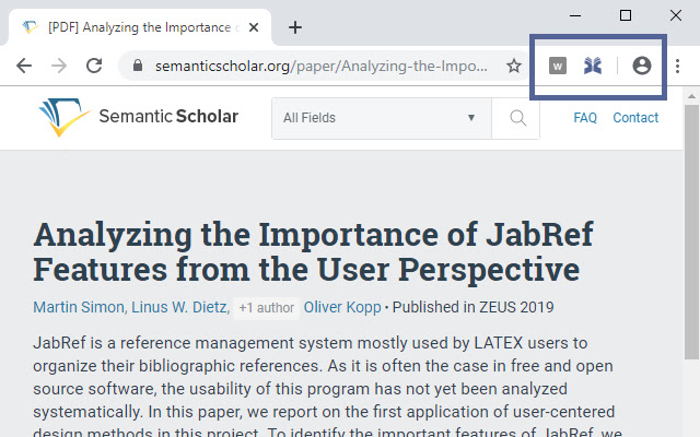 当您通过 Google Scholar、arXiv 或期刊网站找到有趣的文章时,此浏览器扩展程序允许您将这些引用添加到 JabRef。
