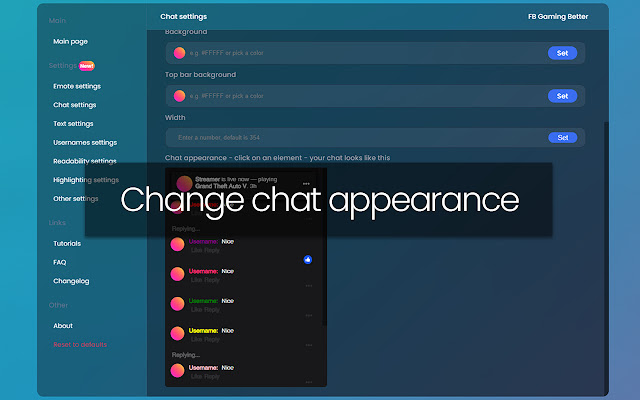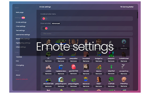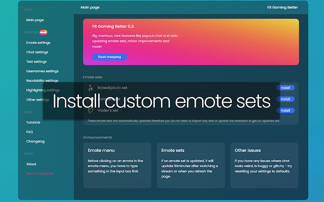 FB 游戏更好。带有设置的表情 + 聊天扩展