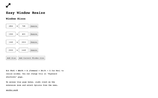 - 您可以使用选项页面中的“添加当前窗口大小”按钮添加当前窗口大小。