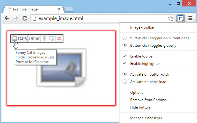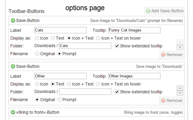 如果您将鼠标移到图像上,图像工具栏会显示一个可自定义的工具栏。包含的按钮可以执行各种操作,例如将图像保存到自定义路径。您可以在选项页面上自定义按钮并创建新的保存按钮。除了用户可定义的保存按钮之外,还有一些无法删除的 p 定义按钮(即“置于最前面”、“作为新选项卡打开”、“隐藏工具栏”),但如果不删除,您可以禁用它们希望它们显示在工具栏中。随着以后的更新,将添加其他按钮类型,例如显示图像信息的按钮。