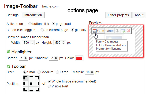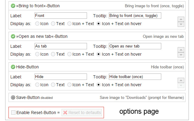 请阅读 https://ht0.de/image-toolbar.html 以简要介绍扩展程序和选项页面上的所有设置。