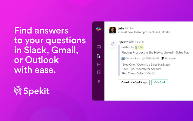 在你做的地方工作。 Spekit 适用于您的所有工具,以显示您需要的答案和流程指导。