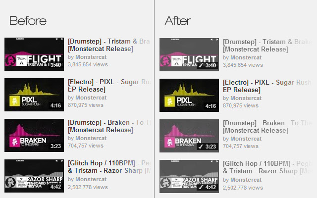 Youtube 的“观看”功能被设计打破了,而且已经存在很长时间了。此扩展程序解决了这个问题,可以轻松查看您观看过哪些视频以及哪些是新视频。