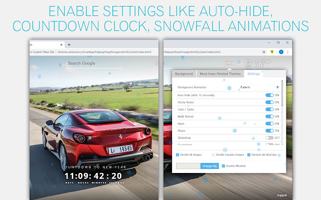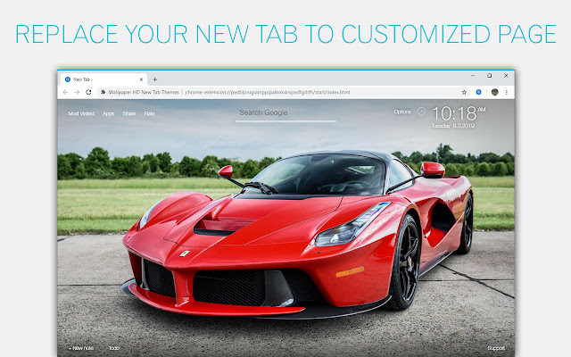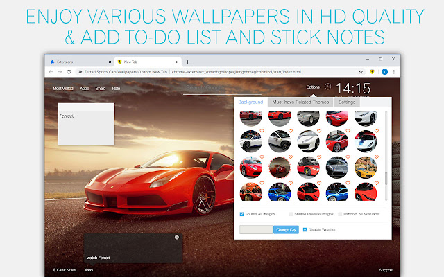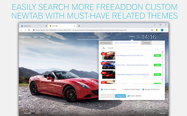 将 newtab 变成定制的法拉利壁纸。为法拉利跑车迷制作的主题。加入所有带有高清法拉利壁纸的 FreeAddon。
