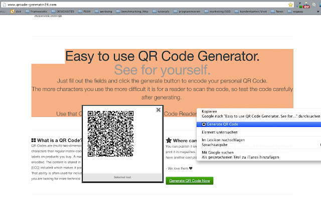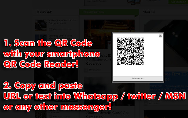 一个QRcode的每一个网站的URL编码或文字。扫描并共享,通过Whatsapp或任何其他SMS或信使。也有用在您的桌面计算机上的任何文字,你写的,并且需要将它发送到您的智能手机,如购物列表或telephon的消息。