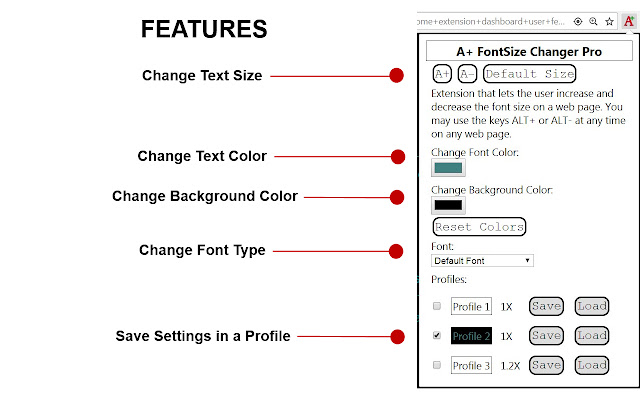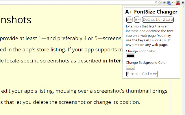 A+ FontSize Changer 可以在其他人失败的地方工作!即使在具有动态(ajax)内容的页面上!即使在带有 iFrame 的页面上!只需使用按钮更改字体大小或使用键盘快捷键 ALT+ 和 ALT-(或使用 ALT+向上箭头和 ALT+向下箭头。您可以在 chrome://extensions/shortcuts 更改这些热键)