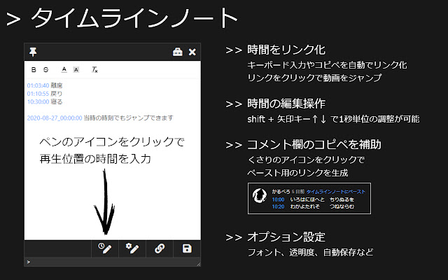 它是一个帮手,为每个视频保存一个备忘录,一键填充播放位置的时间,将视频跳转到输入时间的位置,等等。