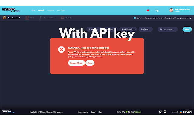 - 它会检测您是否在 Steam 帐户上启用了 API 密钥。如果启用,则可能有人可以访问您的帐户。当您将商品存入 Mannco.store 时,Mannco.store 会向您发送交易请求。劫机者所做的是,他取消该交易,进行新交易,接受该交易并等待您在您的移动验证器上接受该交易。