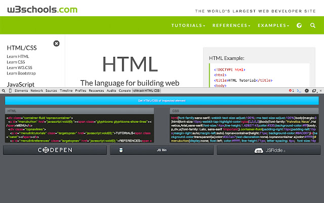 eXtract Snippet 可用于轻松提取任何网站上任何代码段的 HTML 和 CSS 代码。按以下方式从网站中提取 HTML/CSS 片段。安装“eXtract Snippet”=> 使用 chrome 的开发工具“检查元素”检查元素。在开发人员工具中,您还应该看到一个名为“eXtract HTML CSS”的面板。单击“提取 HTML CSS”面板,然后进一步单击面板中的“获取已检查元素的 HTML/CSS”按钮。请耐心等待 eXtractor 仅过滤相关 CSS 并为检查的代码段提取 HTML 代码。较小的片段可能很快完成,较大的片段可能需要一段时间。最终提取的代码与站点上的实际代码段非常匹配,只需单击提取代码下方的按钮即可在“codepen”、“jsfiddle”或“JSbin”上进行查看。请注意,媒体查询是在 1.4 版中提取的,但已为同一媒体规则中的每个选择器复制。 1.4 也附带了从 iframe 中提取 HTML 和 CSS 的更新。